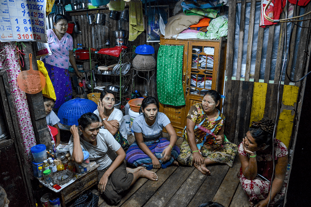 Niin myös Ohmar Htun ja hänen serkkunsa Moe Moe. Tehdas, jossa he ovat töissä, on suljettu. Nuoret naiset kertoivat työstään ja elämästään SASKin Työmaana maailma -lehdessä vuosi sitten. Silloin he istuivat ahtaan suurperheen kodin lattialla keskellä yangonilaisen slummin pimeää iltaa ja kuvailivat pitkiä ja raskaita työpäiviään. Tehtaiden maksama laissa määrätty minimipalkka on niin pieni, että vain runsaasti ylitöitä tekemällä rahat riittivät siskojen, vanhempien ja isovanhempien elatukseen juuri ja juuri.
