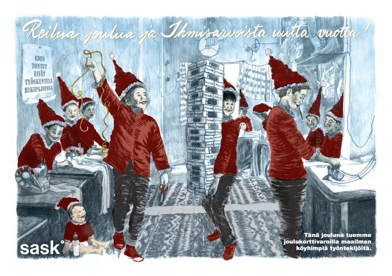 Tänä jouluna sinä voit muistaa maailman heikoimmassa asemassa olevia työntekijöitä. Osallistumalla SASKin joulukampanjaan ilahdutat samalla ystäviäsi eettisellä joulutervehdyksellä.